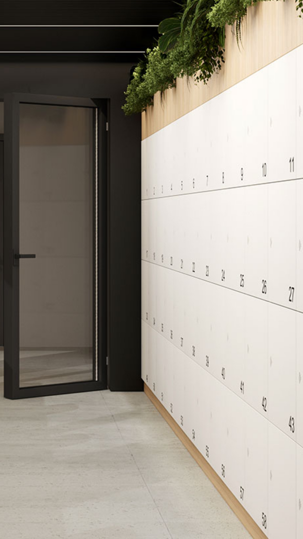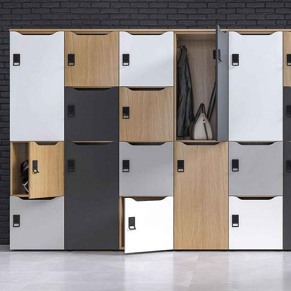 Garderobebokse med 16 rum. Uden strøm og med indbygget kodelås (Ref089)