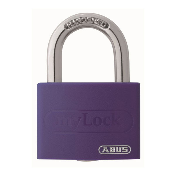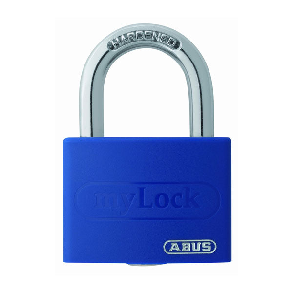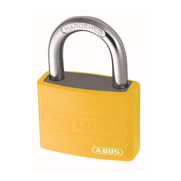 Hængelås med nøgle i aluminium med hærdet stål bøjle i 6 forskellige farver.