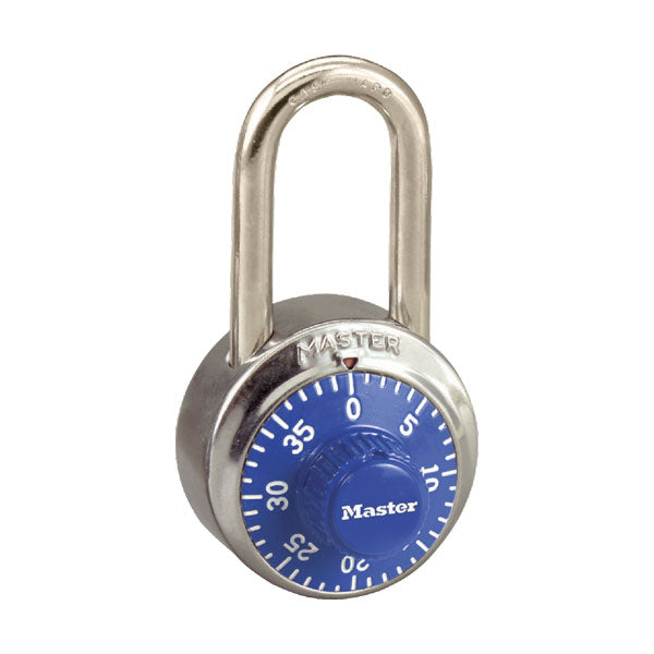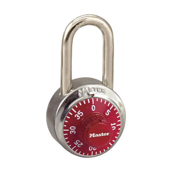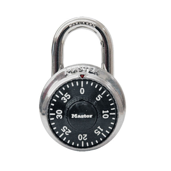 Highschool hængelås - model fra Master Lock No. 1500T Standard Dial Combination. Hængelåsen har et 48 mm bredt metalhus til holdbarhed med et rustfrit stål betræk.