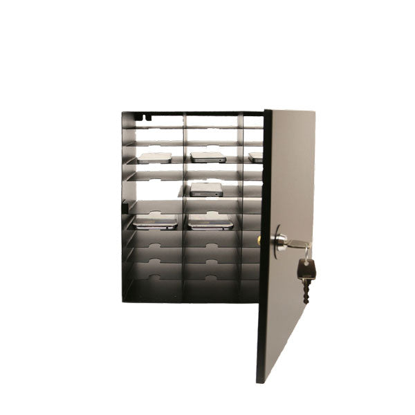 Computerskabe kan leveres med mange forskellige aflåsningssystemer: Cylinderlås med/uden masternøgle, greb til hængelås, mekanisk kodelås, elektronisk kodelås, RFID lås, Ambitlocker eller møntindkast med og uden retur-rende (tilbagebetaling).