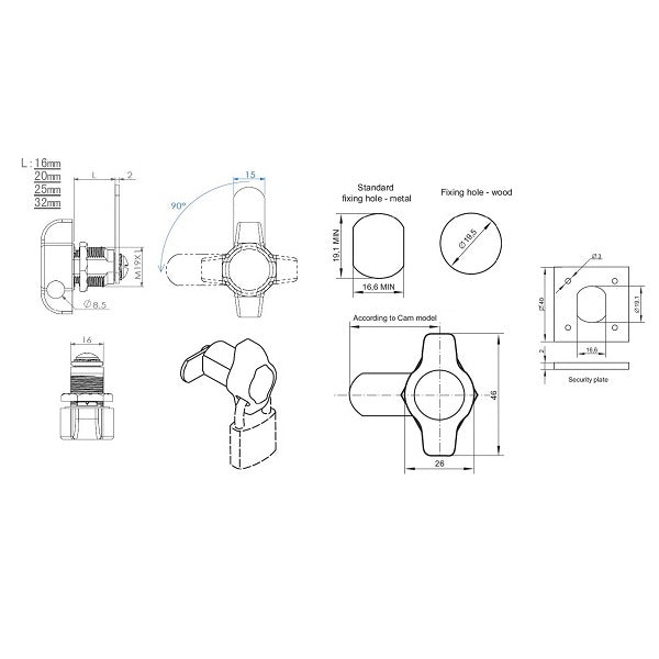 Til denne lås kan der anvendes alle hængelåse med en låsebøjlediameter fra ø5 til ø7mm. Når monteringshullet i lågen er rundt, vil låsen rotere rundt i hullet og dermed ikke kunne låse skabet. Derfor kan anti-rotationsplade tilkøbes, så låsen fikseres i hullet.